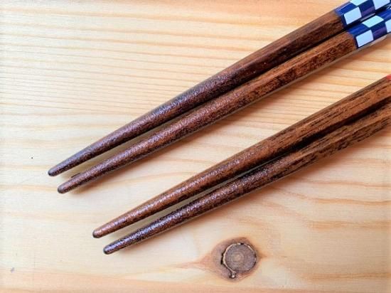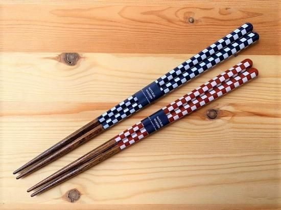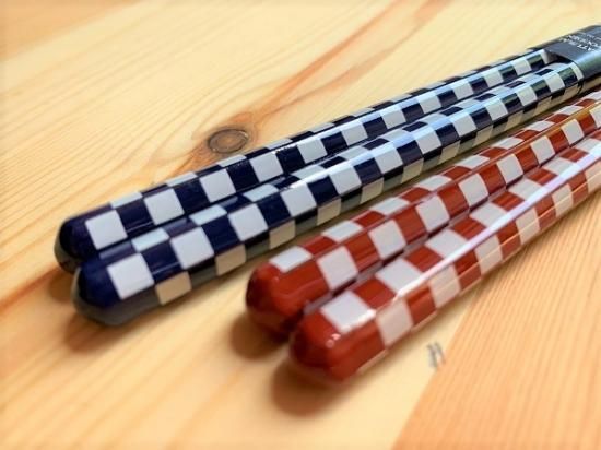 2020年、東京オリンピックのエンブレムのような市松の模様のお箸。箸先だけ木地のまま残して伝統的な市松模様を全体につけたありそうでなかった模様のお箸です。